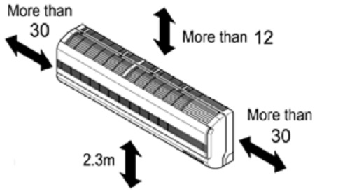 1) واحد داخلي بايد از سقف بين 10 تا 30 سانتيمتر فاصله داشته باشد و فاصله از دیوار کناری 30سانتیمتر باشد. حداکثر فاصلۀ دستگاه از کف 2.3 متر میباشد. توجه شود! در مورد سيستمهاي Art Cool حداقل فاصلهاي كه بايد از دیوار کنار در نظر گرفته شود 50 سانتيمتر ميباشد. 2) واحد داخلی حدالامكان در وسط ديوار نصب گردد تا در پرتاب باد و پوشش دادن كل محيط بازده بالاتري داشته باشد.